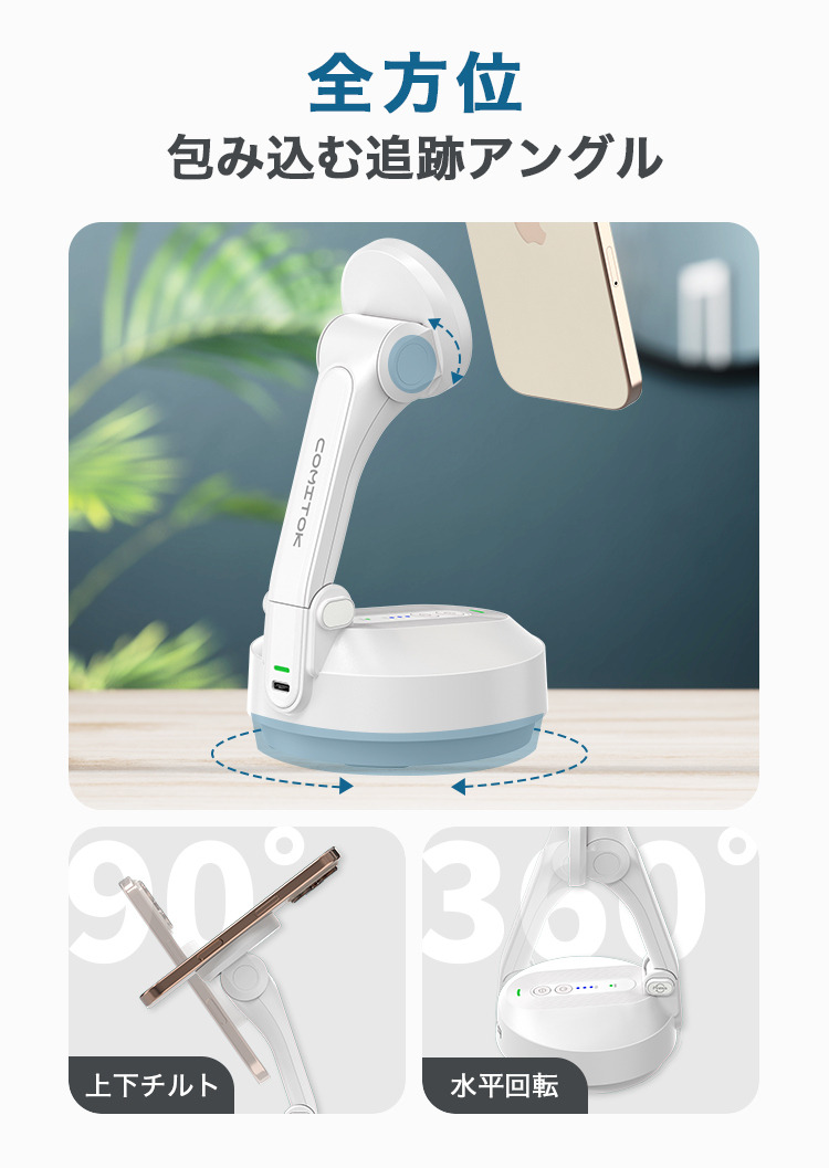 ・水平 360° の全方位トラッキングと、垂直 90° の自動調整機能を搭載